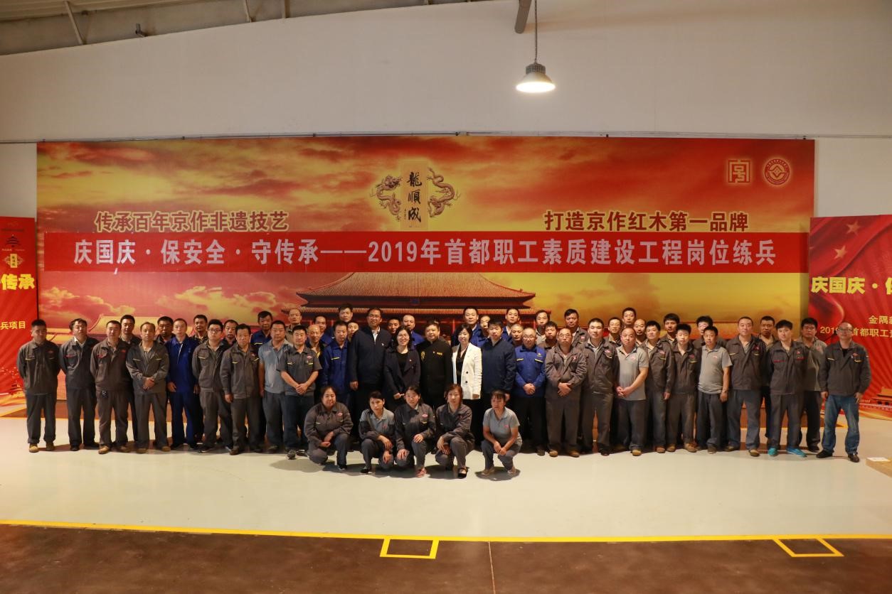 10月12日,为展示首都职工职业风采,提升广大职工职业素质和技能水平,有效助推企业发展和产业转型升级,首都职工素质建设工程支持企业开展“岗位练兵”项目,全年共计50场。由首都职工素质建设工程指导委员会办公室、北京市工会干部学院、北京金隅新型建材产业化集团有限公司联合旗下品牌“天坛家具”与“龙顺成”在龙顺成国家级非遗传承基地举办了“工匠技艺大比拼”活动。通过此次工匠技艺大比拼,让更多的人关注工匠,关注中华传统文化;以“庆国庆•保安全•守传承”为主题开展安全生产知识答题和安全宣传,提升职工安全意识,以“龙顺成非遗基地文化行”为载体,保护非遗文化,让京作文化世代相传。