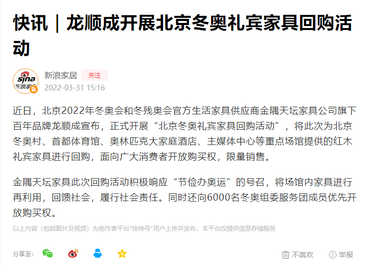 近来,冬奥会在闭幕式之后热度不减。而关于冬奥收藏品价值的话题一直在被大家反复讨论着,龙顺成出品的冬奥场馆礼宾家具也作为本次冬奥赛事中的一抹亮色,引来人们纷纷讨论。更有网友表示:不管是收藏价值还是艺术价值,龙顺成的这批家具都是最值得入手的。