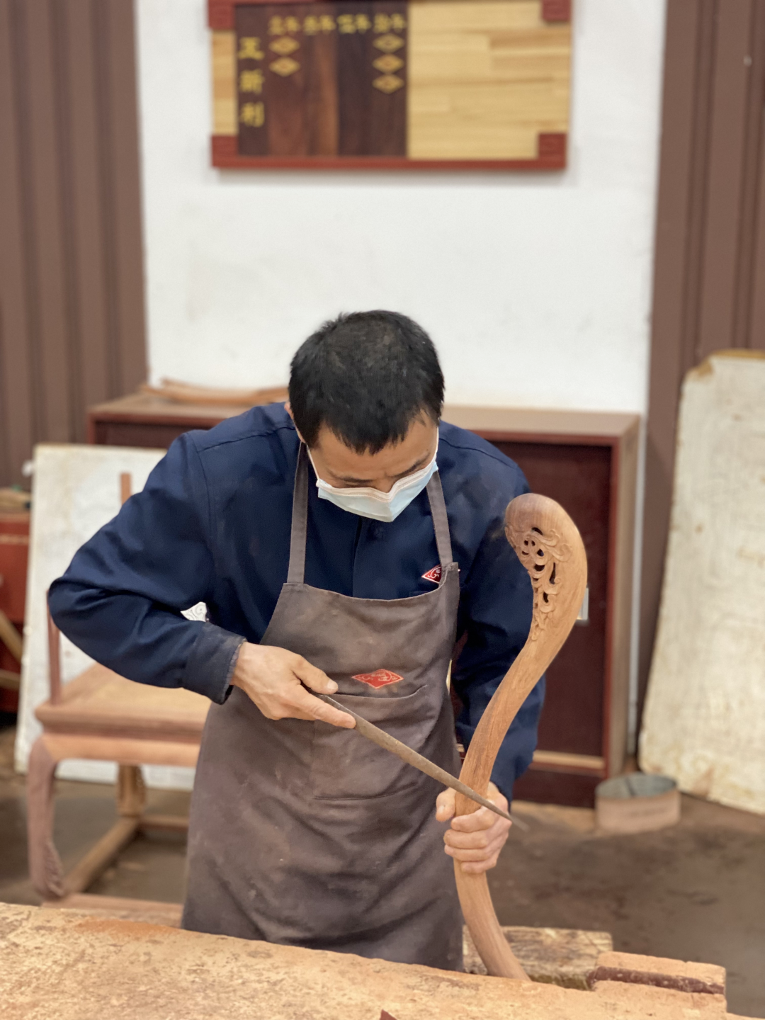 京作硬木家具制作是典型的精工细做,工序流程精细且复杂,制作周期长,从原木到成品需要经过几十道工序才能完成,龙顺成在雕刻、组装、刮磨、烫蜡等许多工序仍然保留着传统的手工制作,完美展现家具的“型、材、艺、韵”。