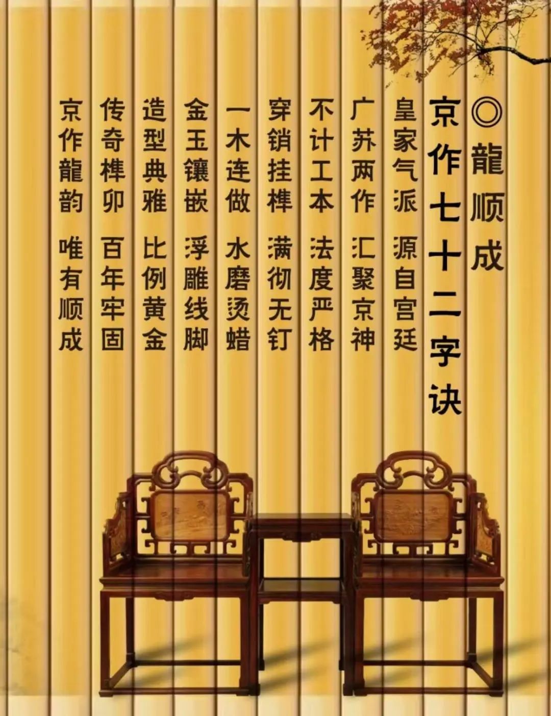 2007年5月,龍顺成“京作硬木家具制作技艺“入选北京市级非物质文化遗产名录,并于2008年6月,入选国家级非物质文化遗产名录。