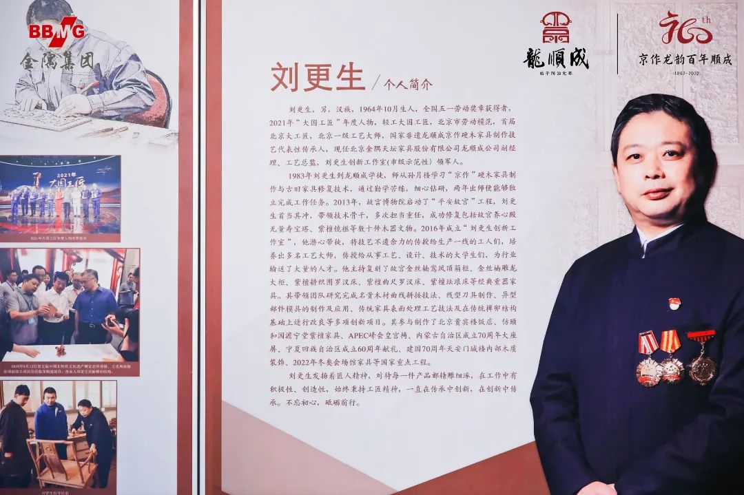 今年3月,刘更生荣获由中华全国总工会、中央广播电视总台颁布的2021年“大国工匠”年度人物,这是对以刘更生为代表的无数产业工人不忘初心,开拓进取鲁班精神的激励,刘更生现场分享了对鲁班工匠精神的一些感悟和“格物之致 匠造之擢 龙顺成公司成立160周年大国工匠紫檀经典重器展”内容。