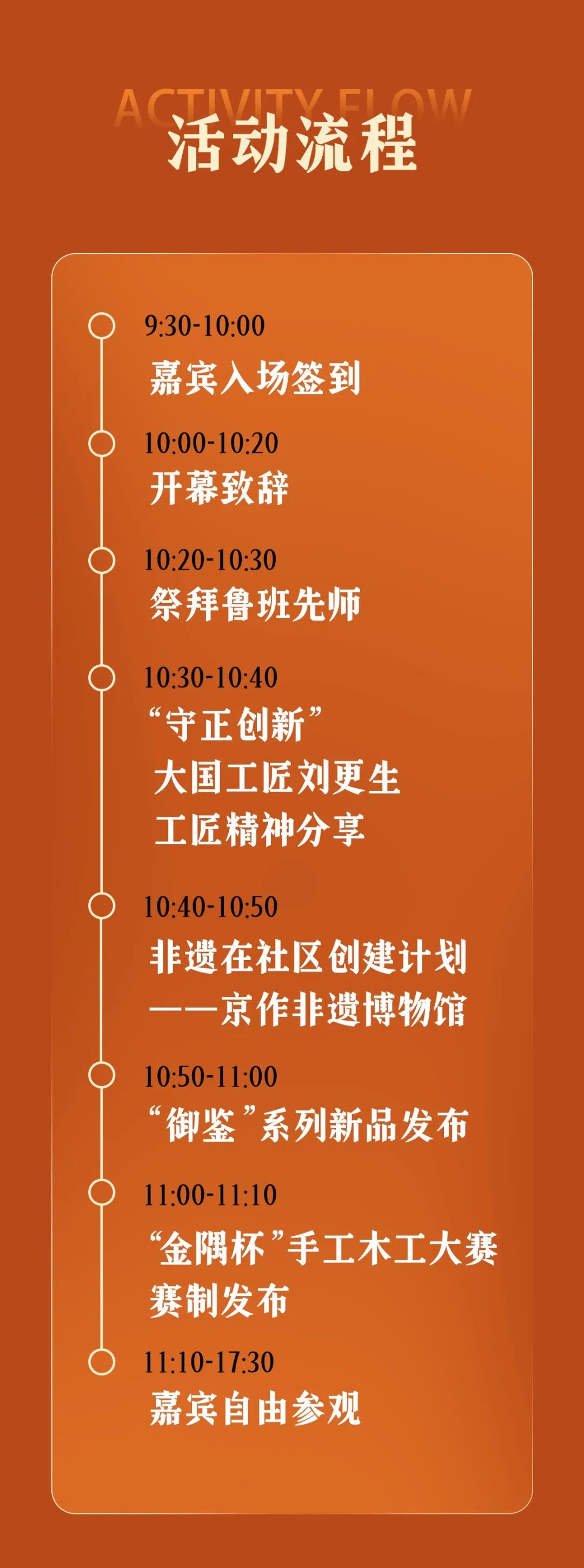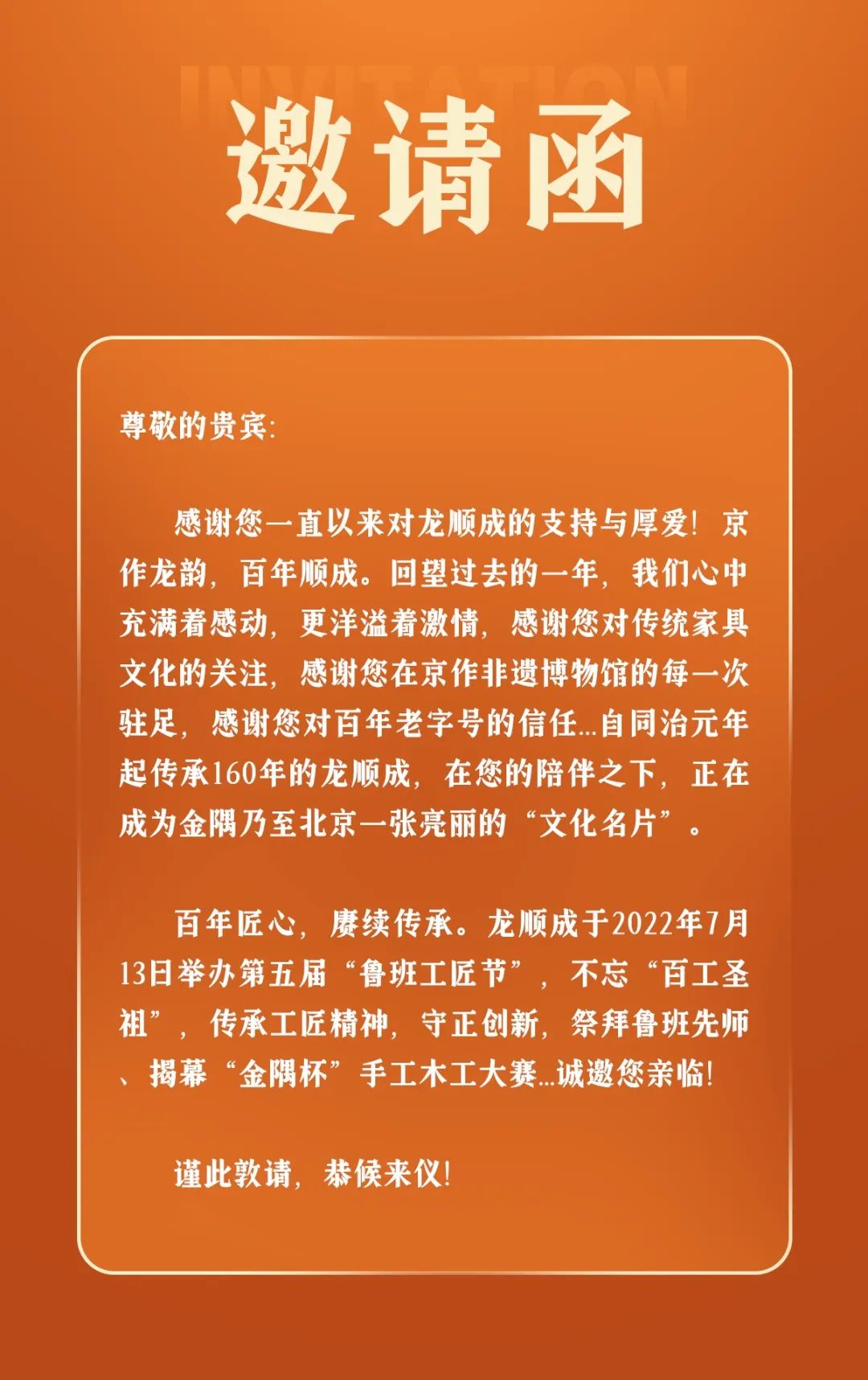 2022年7月13日,龙顺成拟于金隅龙顺成文化创意产业园内举办“‘金隅杯’手工木工大赛发布暨第五届龙顺成鲁班工匠节”,祭拜鲁班先师、大国工匠刘更生工匠精神分享、非遗在社区创建计划(京作非遗博物馆)、“御鉴”系列新品发布会、“金隅杯”手工木工大赛“赛制发布一系列活动,搭建手工木工企业相互交流学习平台,厚植工匠精神,扩大社会对手工木工行业认知度。