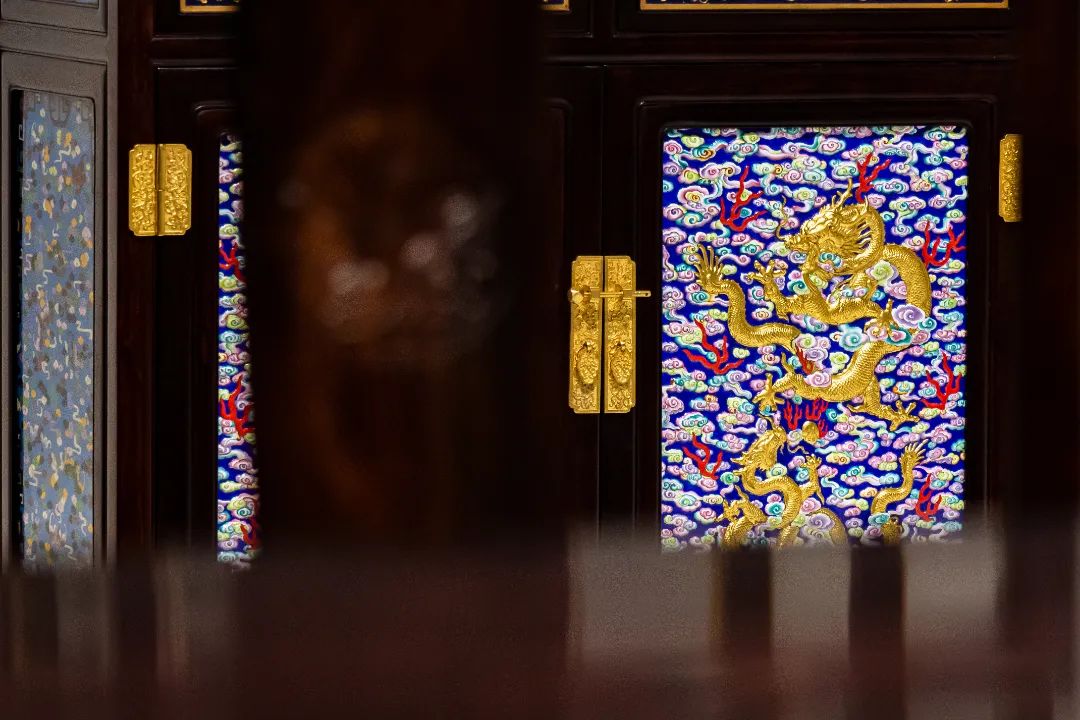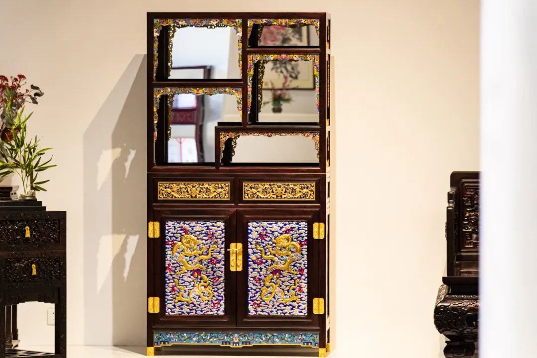 门边框采用外圈混面大、内圈混面小的双混面做法。边框内镶云龙纹板心,以蓝色为地,凸现五色斑斓的流云和上下两首相望的金黄色升龙。门框上镶有铜质錾云龙纹合叶、面叶及拉手。柜两侧嵌有云蝠纹掐丝珐琅绦环板。柜下的正面及侧面皆有缠枝花卉纹洼堂肚式珐琅牙子。腿足有铜錾云龙纹套足,华美非常。