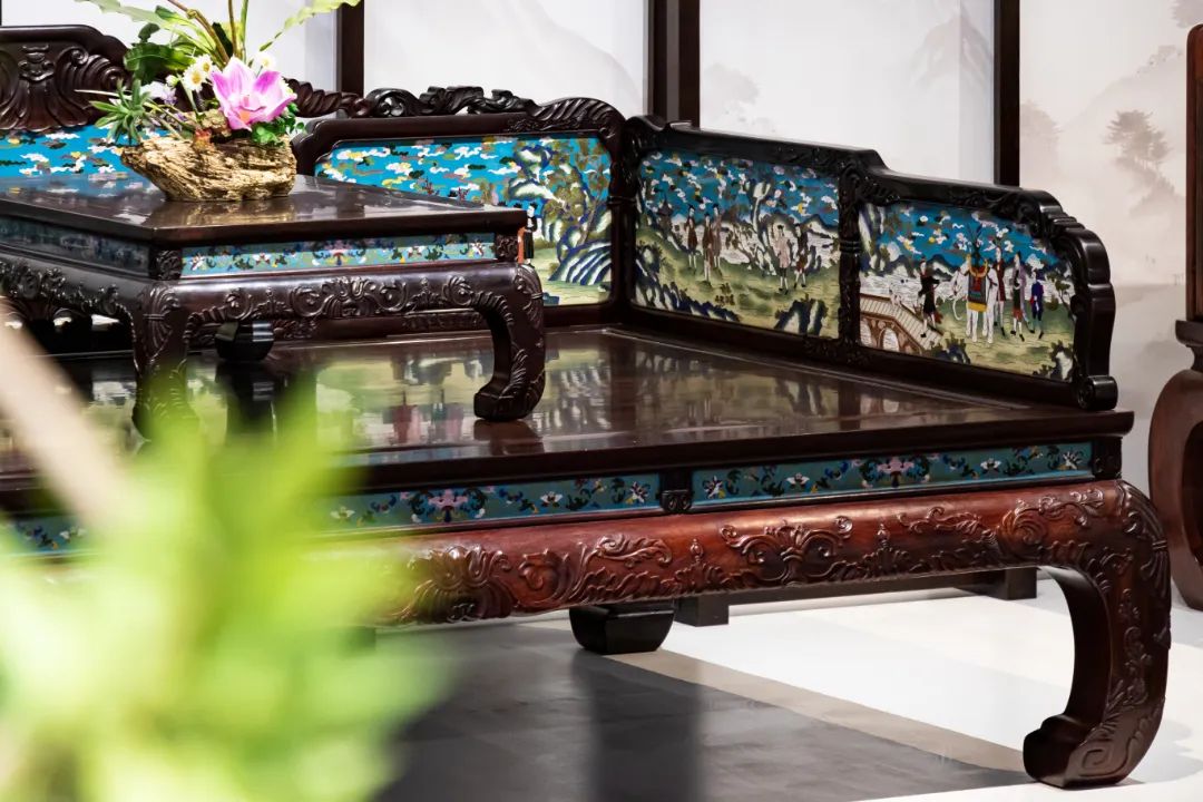 在故宫的南大库,陈列着一张清中期的紫檀嵌珐琅罗汉床,床面上三面围子呈七屏式,每屏以紫檀雕刻西洋花纹及绳节纹为框,镶嵌珐琅西洋人物图。屏框上边紫檀雕刻西洋花纹屏帽。床面泥鳅背式侧沿。高束腰以矮柱分界为格,每格皆镶嵌珐琅西洋花纹。鼓腿膨牙,内翻回纹马蹄足。紫檀木制框架,床靠背和扶手芯板嵌珐琅片。