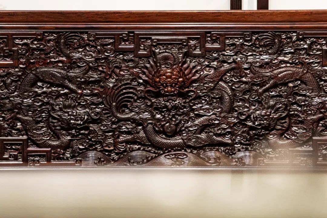 靠背中间雕有正脸的五爪麟龙,两侧雕四条行龙,扶手里外各雕两条行龙。中间布海水云纹,五爪麟龙形态各异,穿行于云海之间。