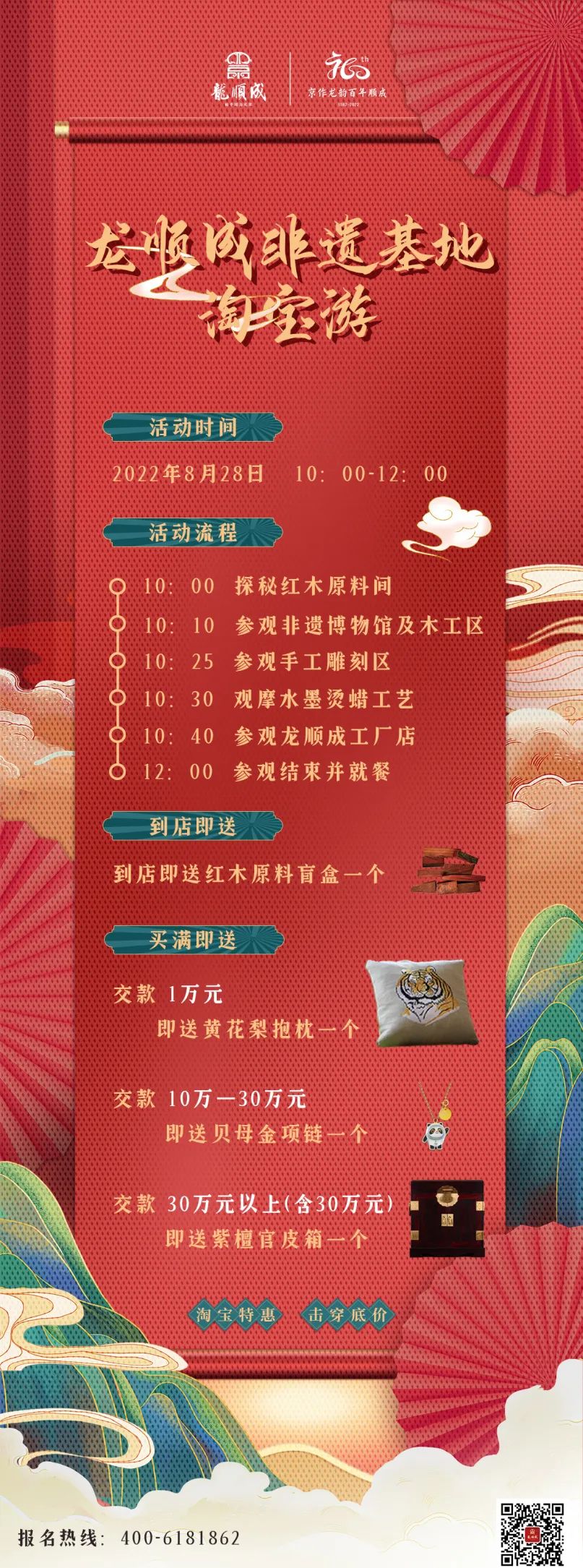8月14日龙顺成非遗基地淘宝游由于天气原因,不少粉丝遗憾未能到场,在广大红木爱好者的呼声中,8月28日(星期日)非遗基地淘宝游活动来咯,报名从速!