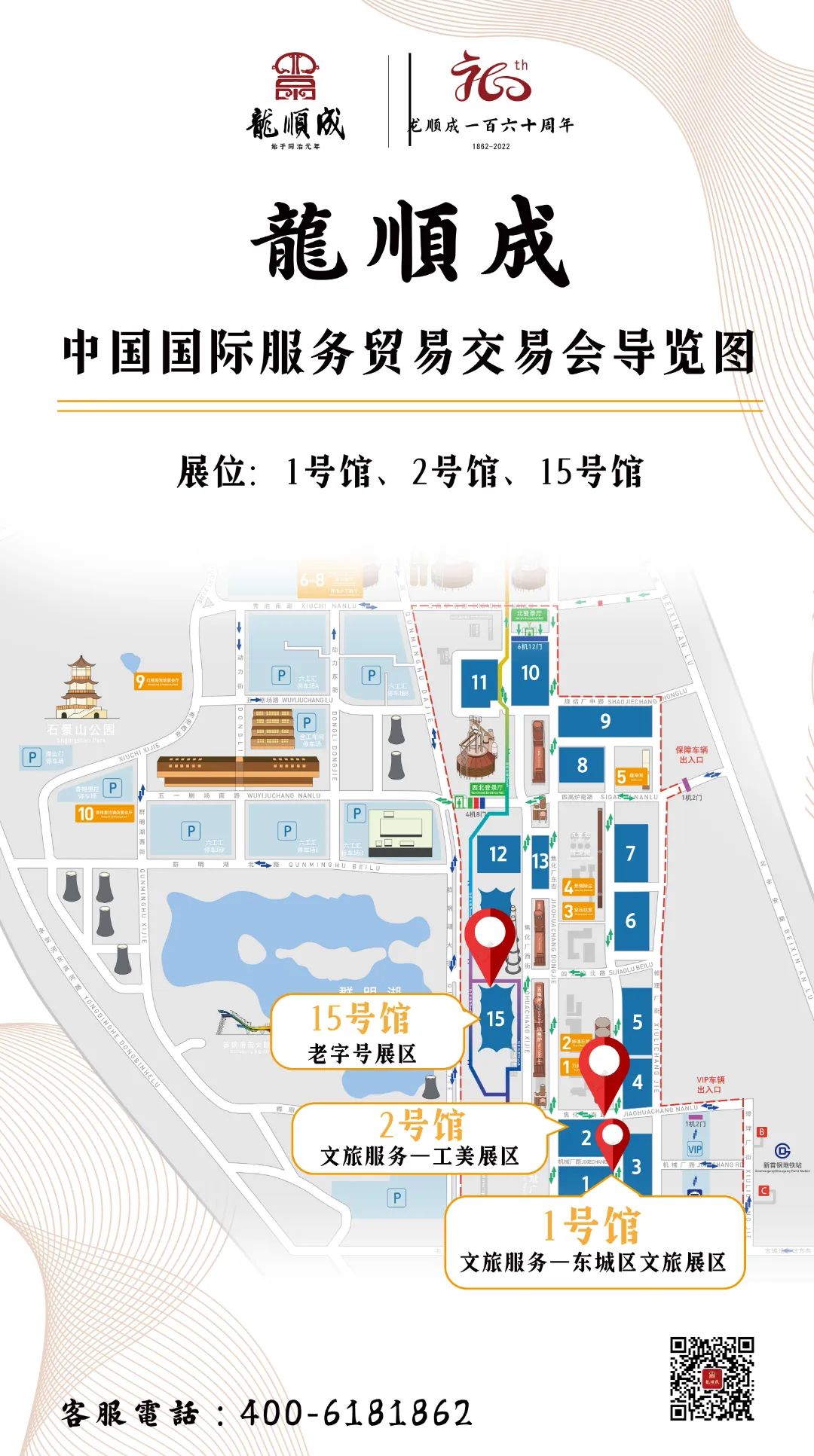 首钢园展区设置了专题展,包括:文旅服务、健康卫生服务、体育服务、金融服务、教育服务、供应链及商务服务、工程咨询与建筑服务、电信服务8大专题展。龙顺成服贸会展区多个点位全覆盖,亮相1号馆、2号馆、15号馆三大展区,期待新老顾客参观。