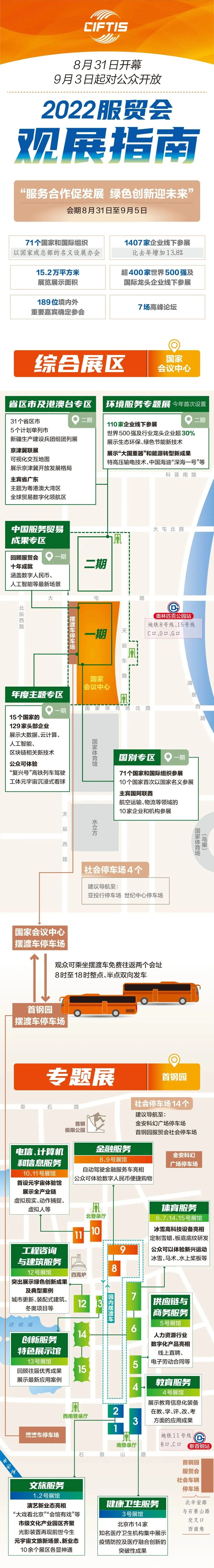 2022年中国国际服务贸易交易会8月31日-9月5日在国家会议中心和首钢园区举办,以线上线下结合的形式,“服务合作促发展 绿色创新迎未来”为主题,线下展览展示总面积15.2万平方米,充分展示各类新技术、新成果、新业态、新模式。