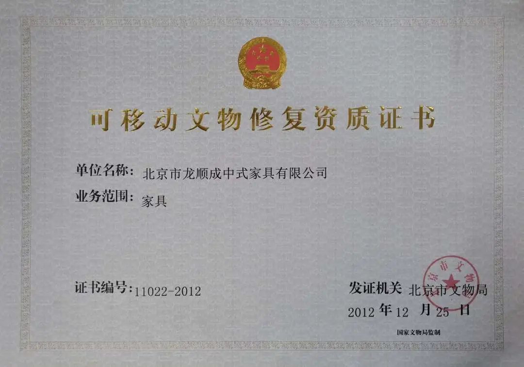 龙顺成古旧家具修复中心,具有国家一级文物修复资质并承担着为国家博物馆、故宫等单位修复古旧家具的任务。设立古旧家具修复中心(业内称“旧活”),将古老的家具旧部件与独特的修旧技艺相结合,还古旧家具以原貌,创造出了一件件具有收藏价值的古旧家具产品。